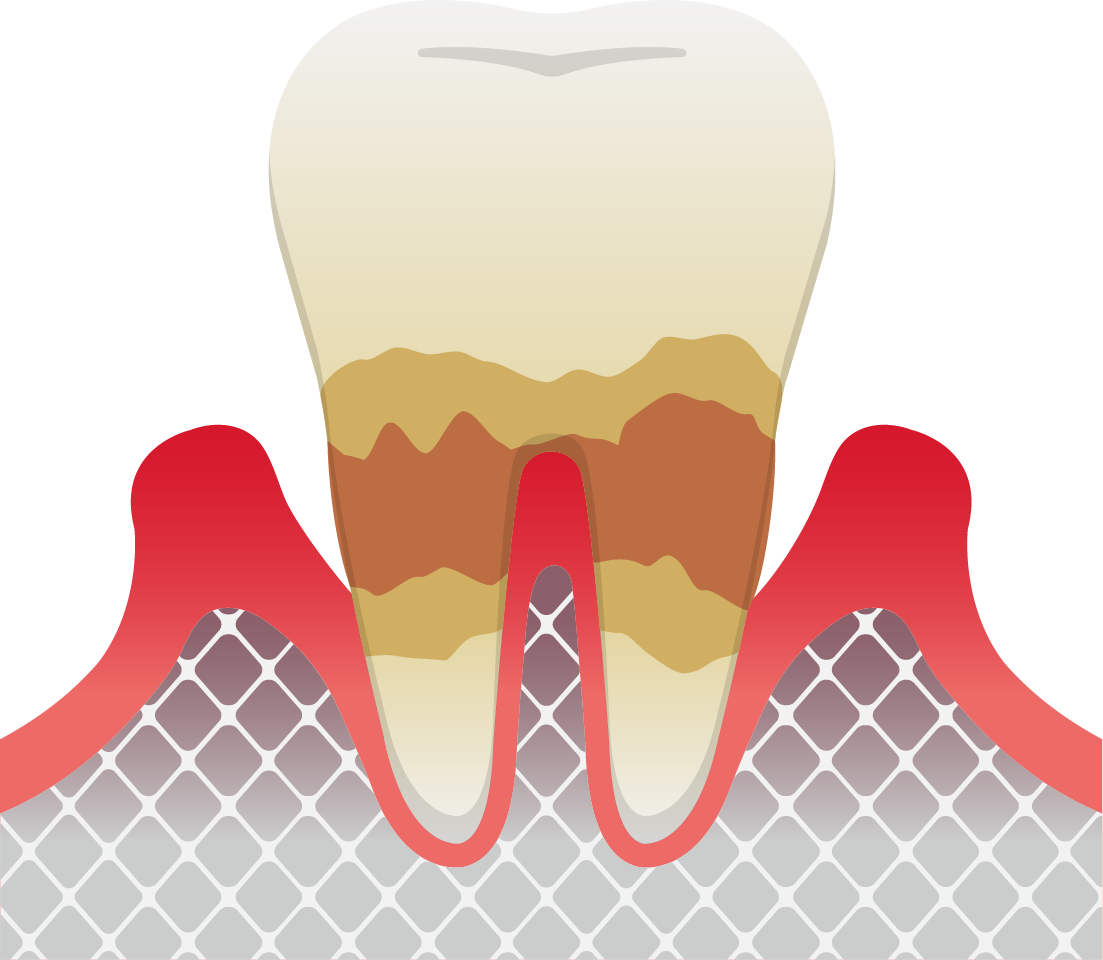 症状 進行した歯周病菌によって顎の骨がさらに溶かされ、歯ぐきから出血するだけでなく膿が出るようになってきます。歯周ポケットの深さは4~5mmです。 治療法 歯ぐきを切開して歯周ポケット内部の汚れを除去する手術を行ってから、歯の表面を滑らかにする処置を行います。 |