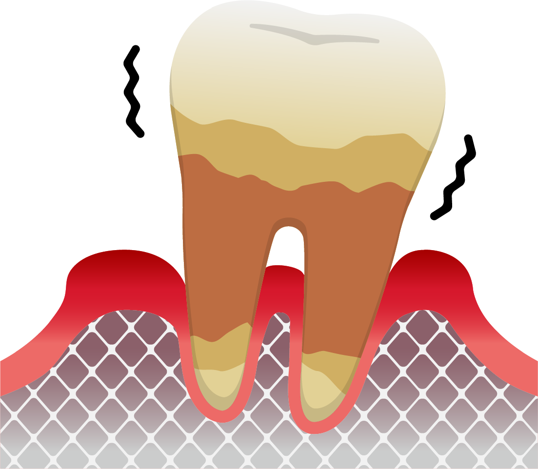 症状 歯周病菌によって顎の骨が大きく溶かされて歯がグラつき、抜けてしまうこともあります。歯ぐきからは膿が出て口臭も強くなります。 治療法 歯ぐきを切開して歯周ポケット内の歯垢や歯石を掻き出して汚染された歯肉も除去します。歯を残せないほど進行してしまった場合は抜歯して、入れ歯やインプラント治療を行います。 |